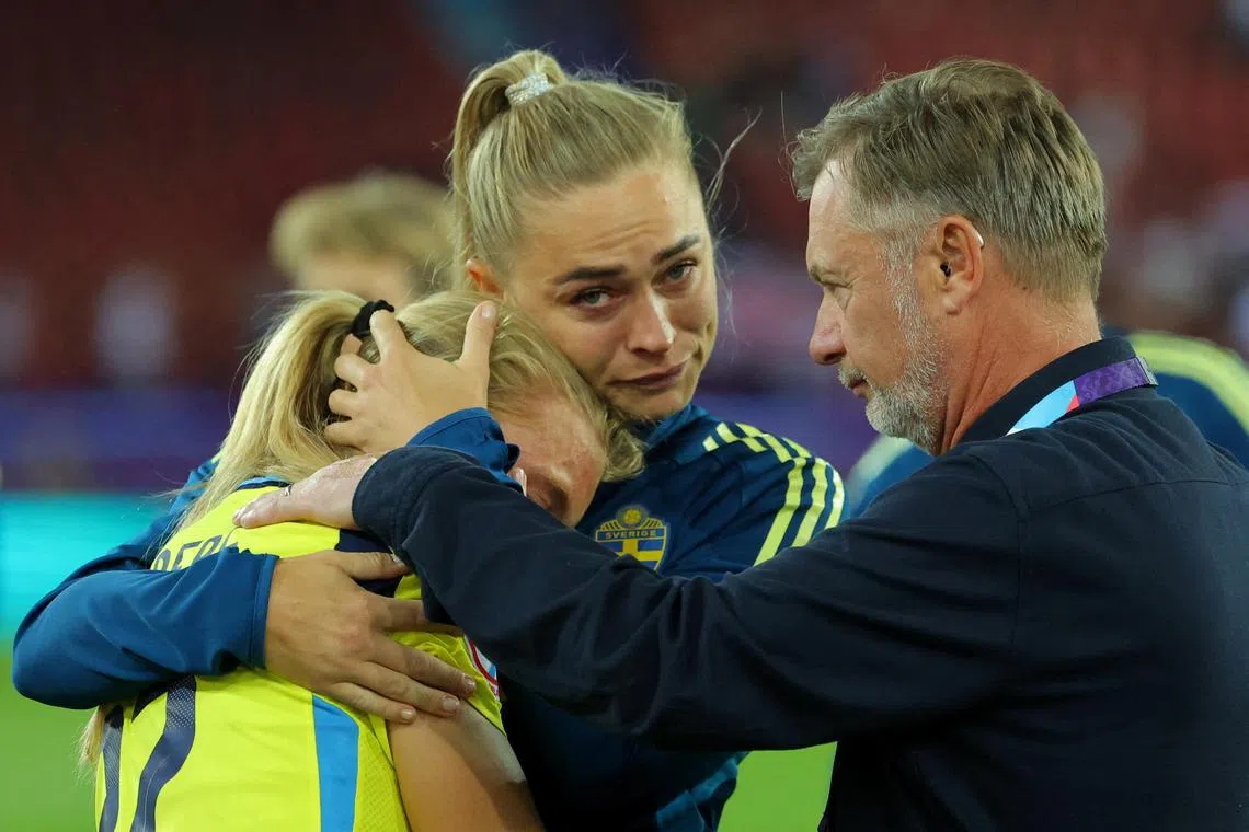 Sweden’s Smilla Holmberg is consoled by Fridolina Rolfo and coach Peter Gerhardsson at the end of the match.