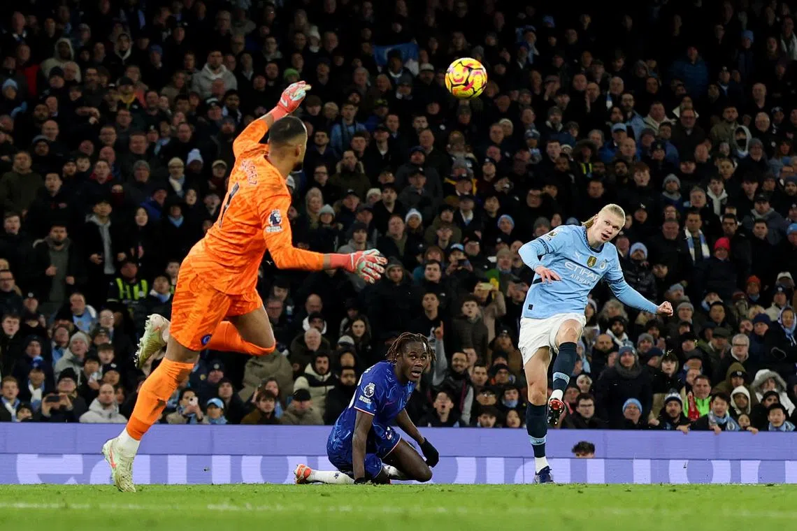 Manchester City’s Erling Haaland scoring their second goal past Chelsea goalkeeper Robert Sanchez in the 3-1 win at the Etihad Stadium on Jan 25.