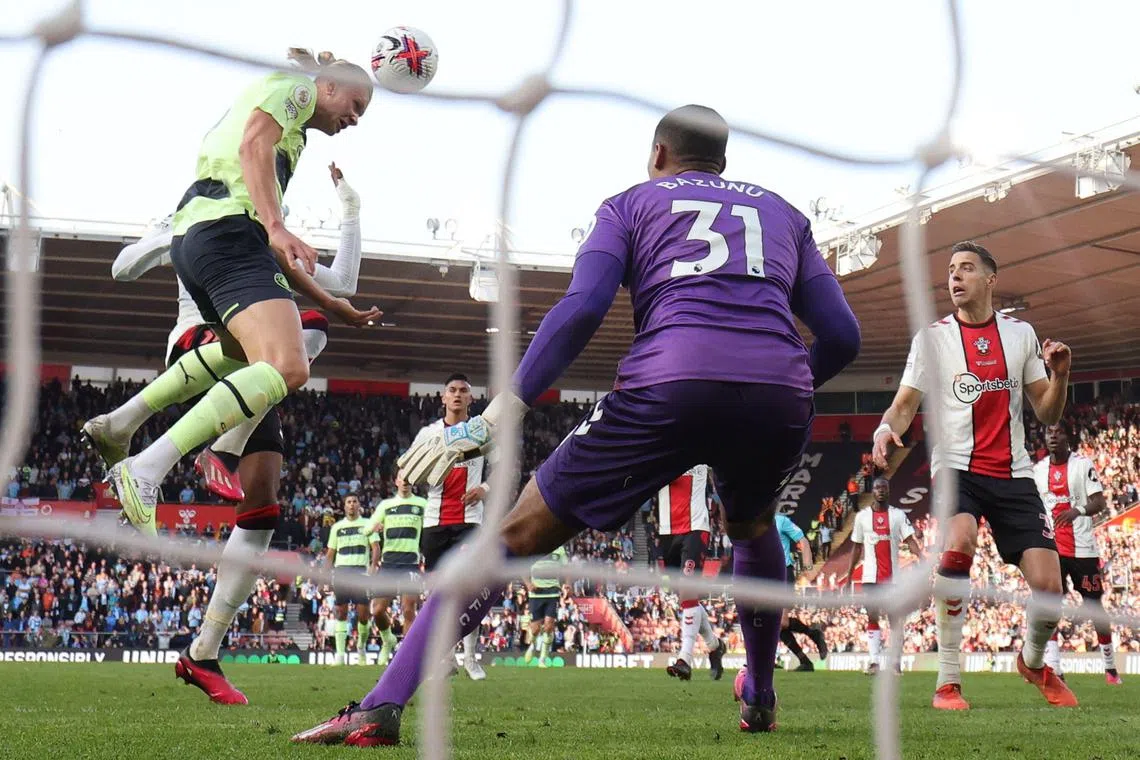 Southampton keeper Gavin Bazunu had to make an early save from Jack Grealish after a sweeping attack by the visitors, pushing away a stinging shot and steering the ball out of the path of the onrushing Haaland.