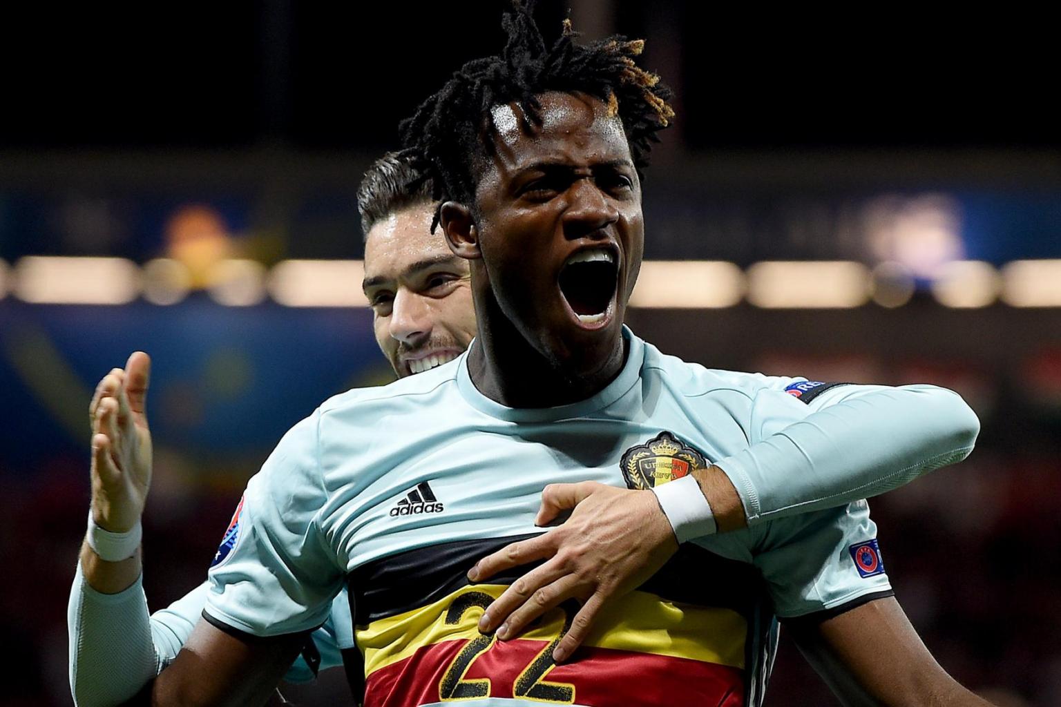 Michy Batshuayi of Belgium (front) celebrates scoring with Yannick Ferreira Carrasco during the Uefa Euro 2016 round of 16 match between Hungary and Belgium.