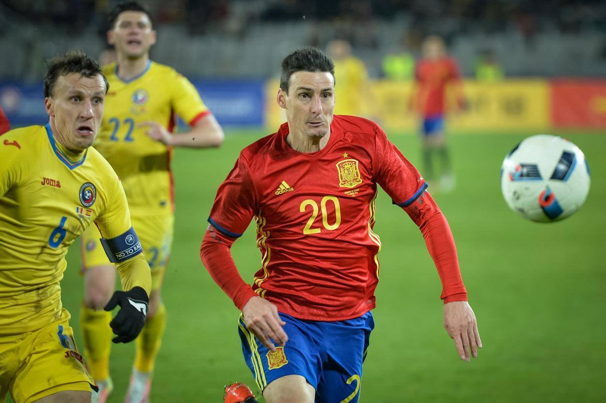 Spain’s Aritz Aduriz (right) during a friendly match against Romania on March 27. PHOTO: AFP