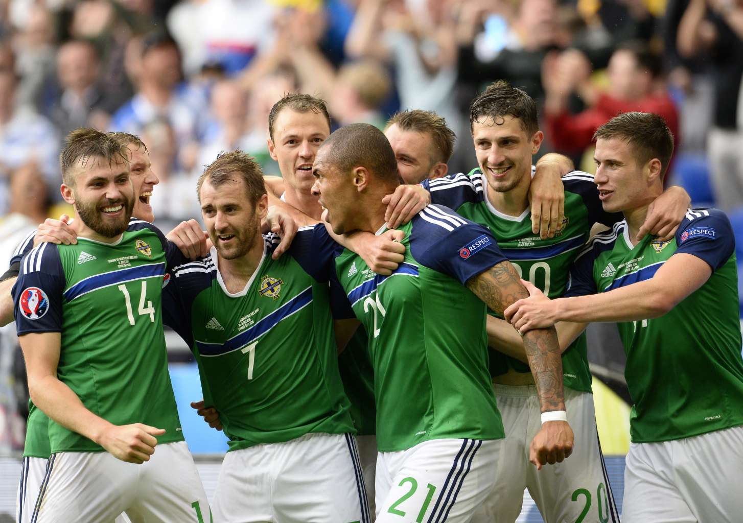 Northern Ireland players celebrate after Niall McGinn (third left) scored the 2-0 goal.