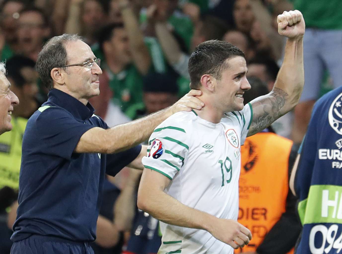 Republic of Ireland head coach Martin O'Neill celebrates with Robbie Brady at the end of the match.