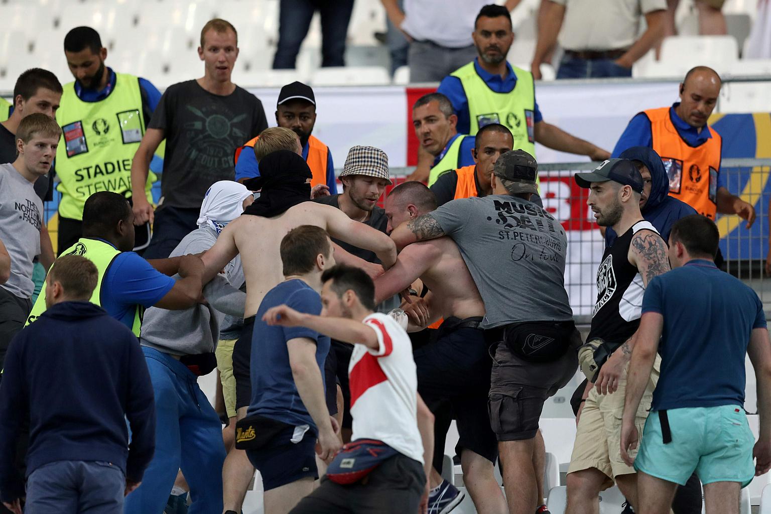 Groups of supporters clash at the end of the Euro 2016 group B football match between England and Russia at the Stade Velodrome in Marseille.