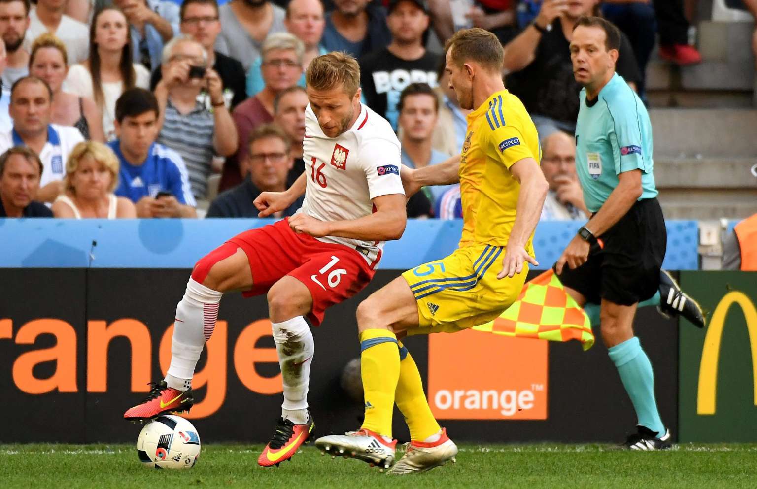 Poland's Jakub Blaszczykowski (left) and Olexandr Kucher (right) of Ukraine in action during the Uefa Euro 2016 group C football match.
