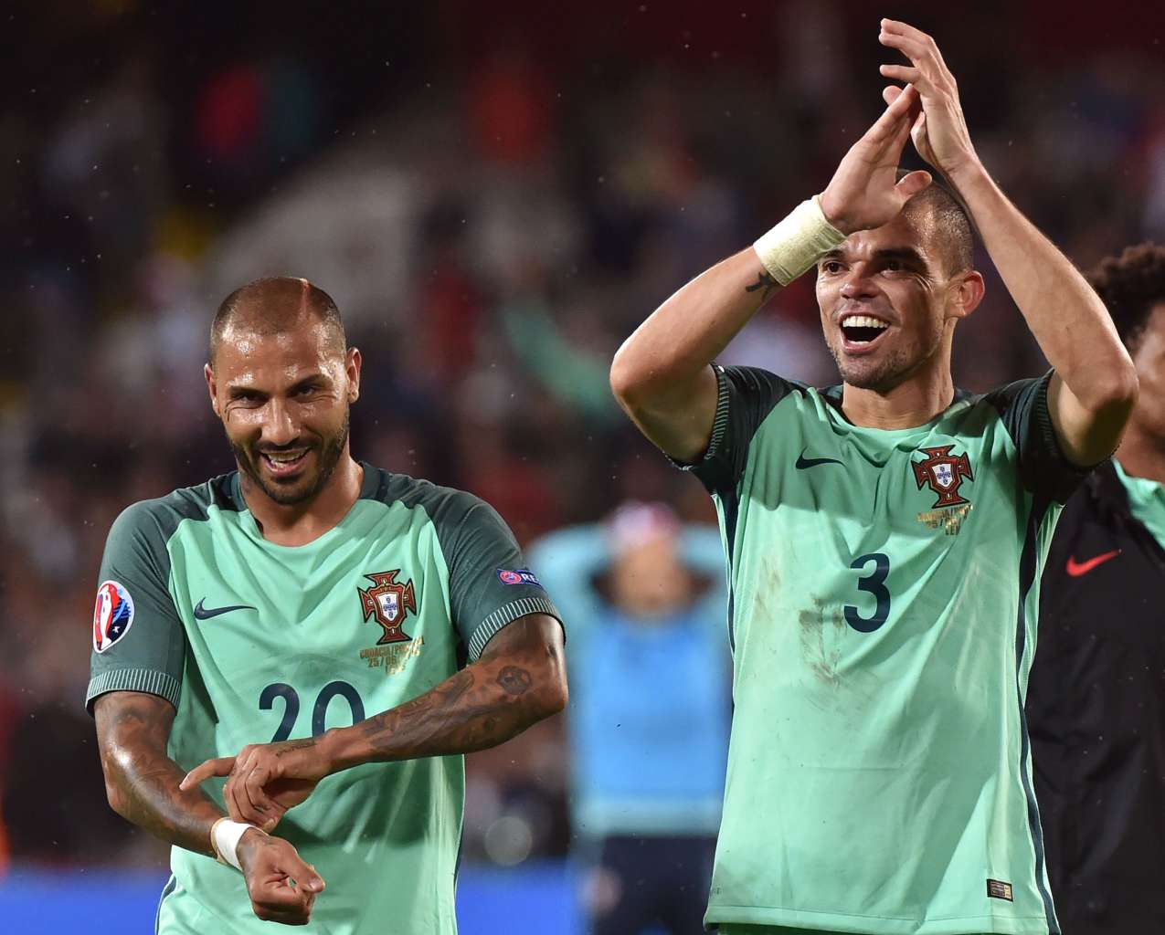 Portugal's defender Pepe (right) and forward Ricardo Quaresma celebrate at the end of the match.