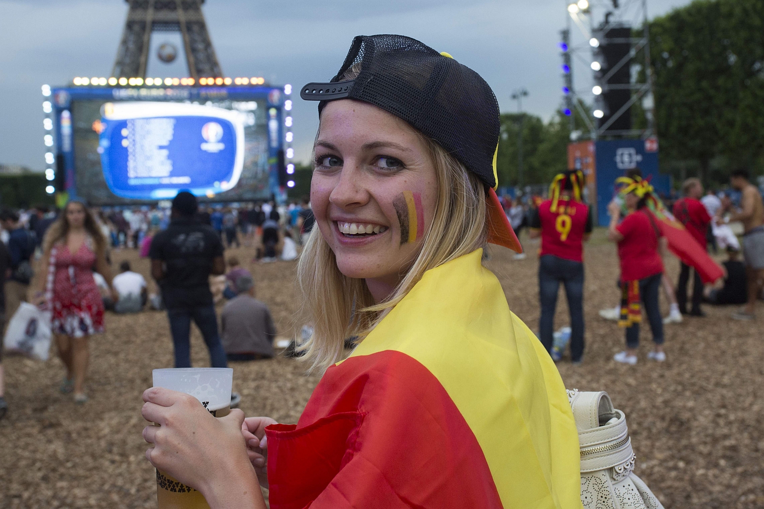 A Belgian fan watching the match against Sweden on a giant screen near the Eiffel Tower on June 22.
