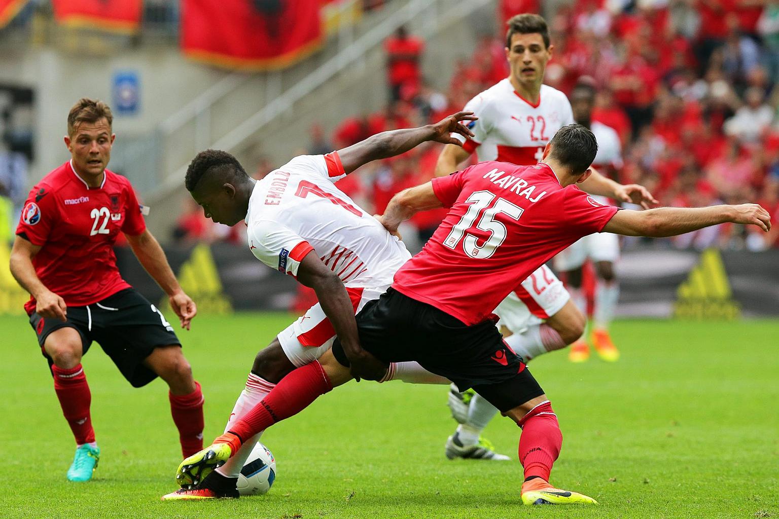 Switzerland's Breel Embolo (centre) in action against Albanian players Amir Abrashi (left) and Mergim Mavraj (right) during the Uefa Euro 2016 match between Albania and Switzerland.