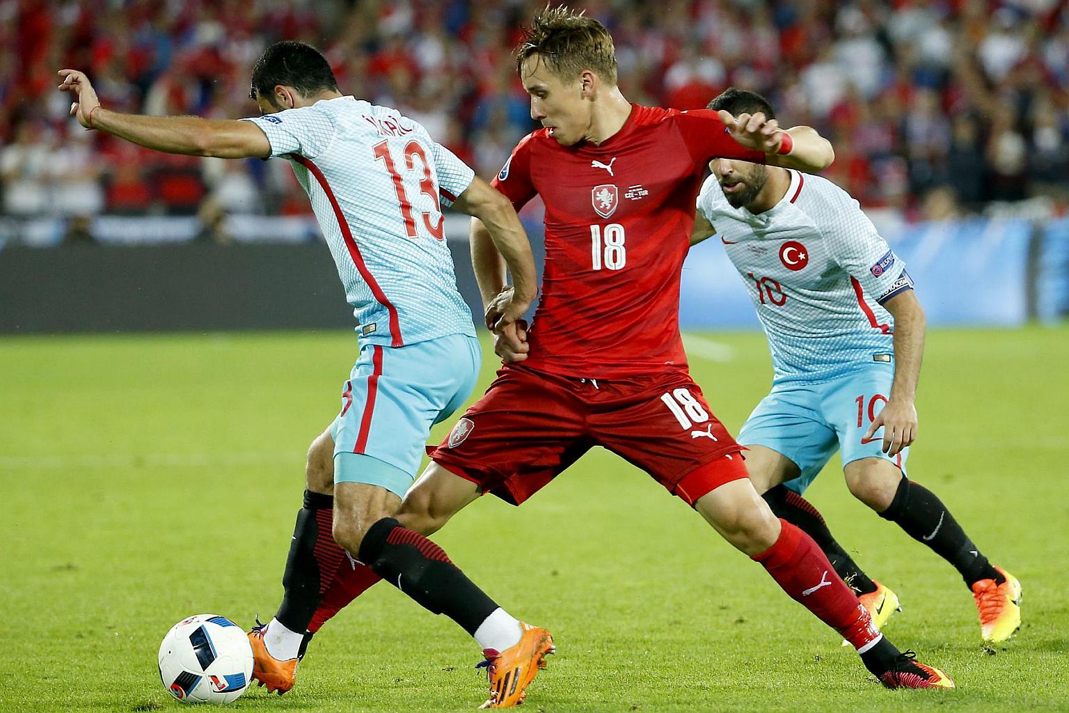 Josef Sural of Czech Republic (centre) and Ismail Koybasi of Turkey (left) in action during their Uefa Euro 2016 group D football match.