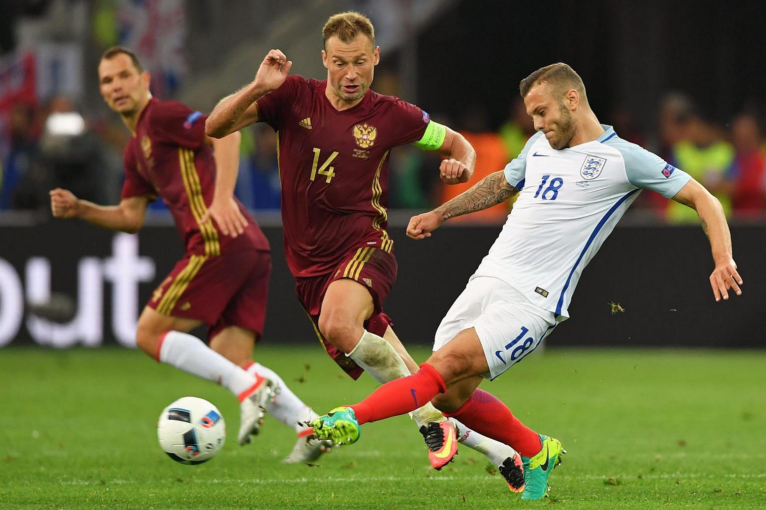 Jack Wilshere (right) of England in action against Vasili Berezutski of Russia during the Uefa Euro 2016 match between England and Russia.