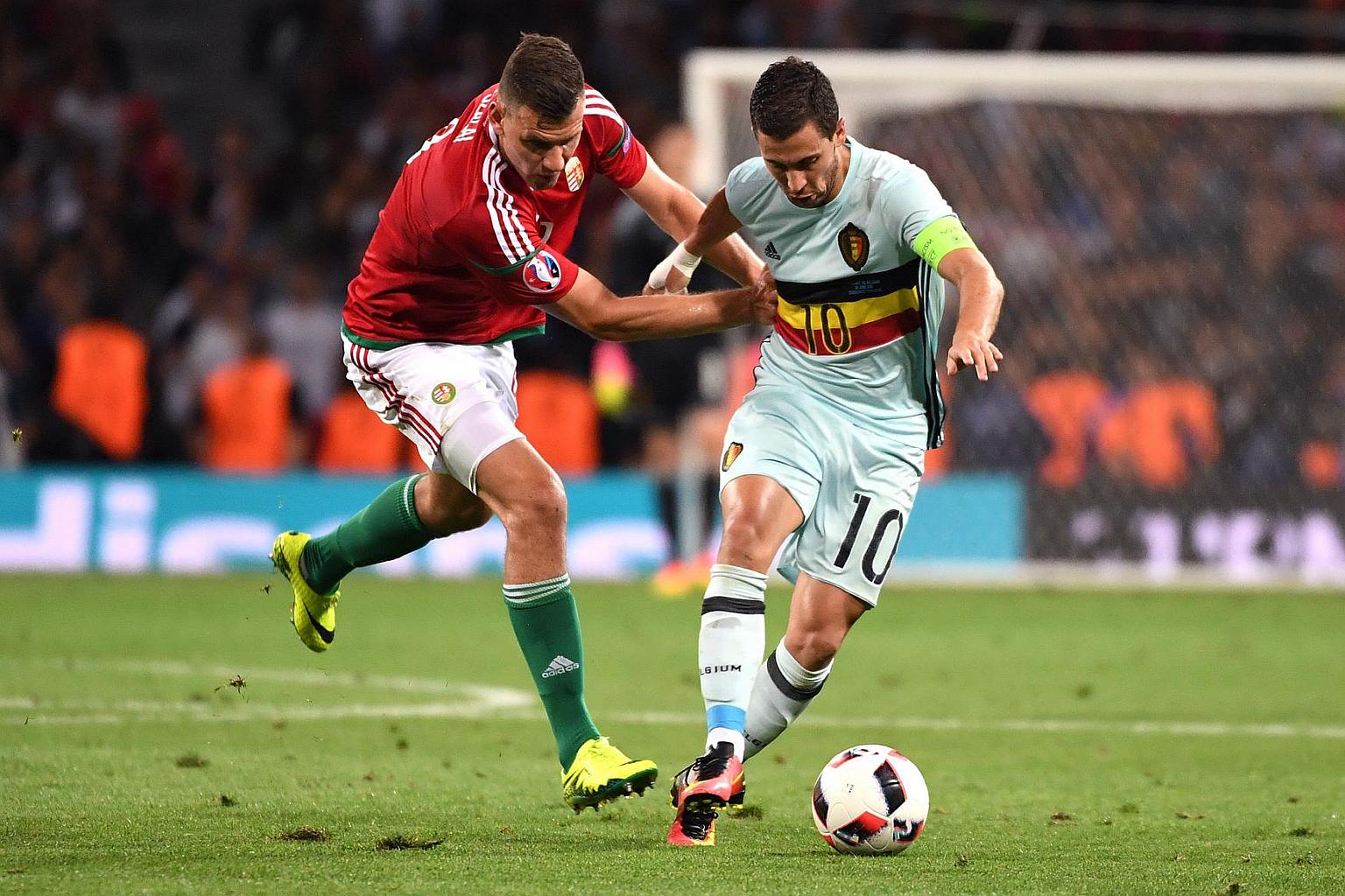 Hungary's forward Adam Szalai (left) vies for the ball with Belgium's forward Eden Hazard during the Euro 2016 football match on June 26.