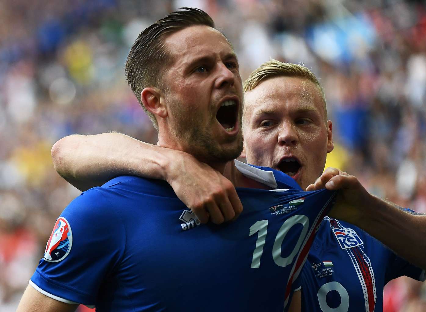Iceland midfielder Gylfi Sigurdsson (left) celebrates after scoring his team's first goal.