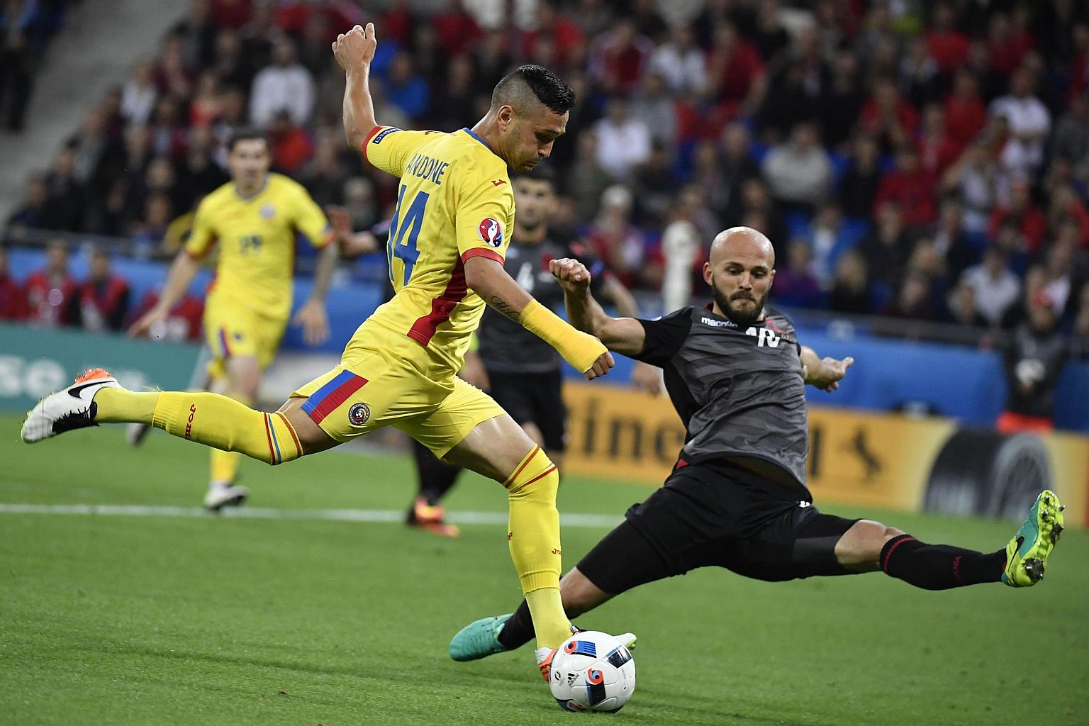 Romania's forward Florin Andone (left) vies for the ball with Albania's defender Arlind Ajeti during the Euro 2016 football match between Romania and Albania.