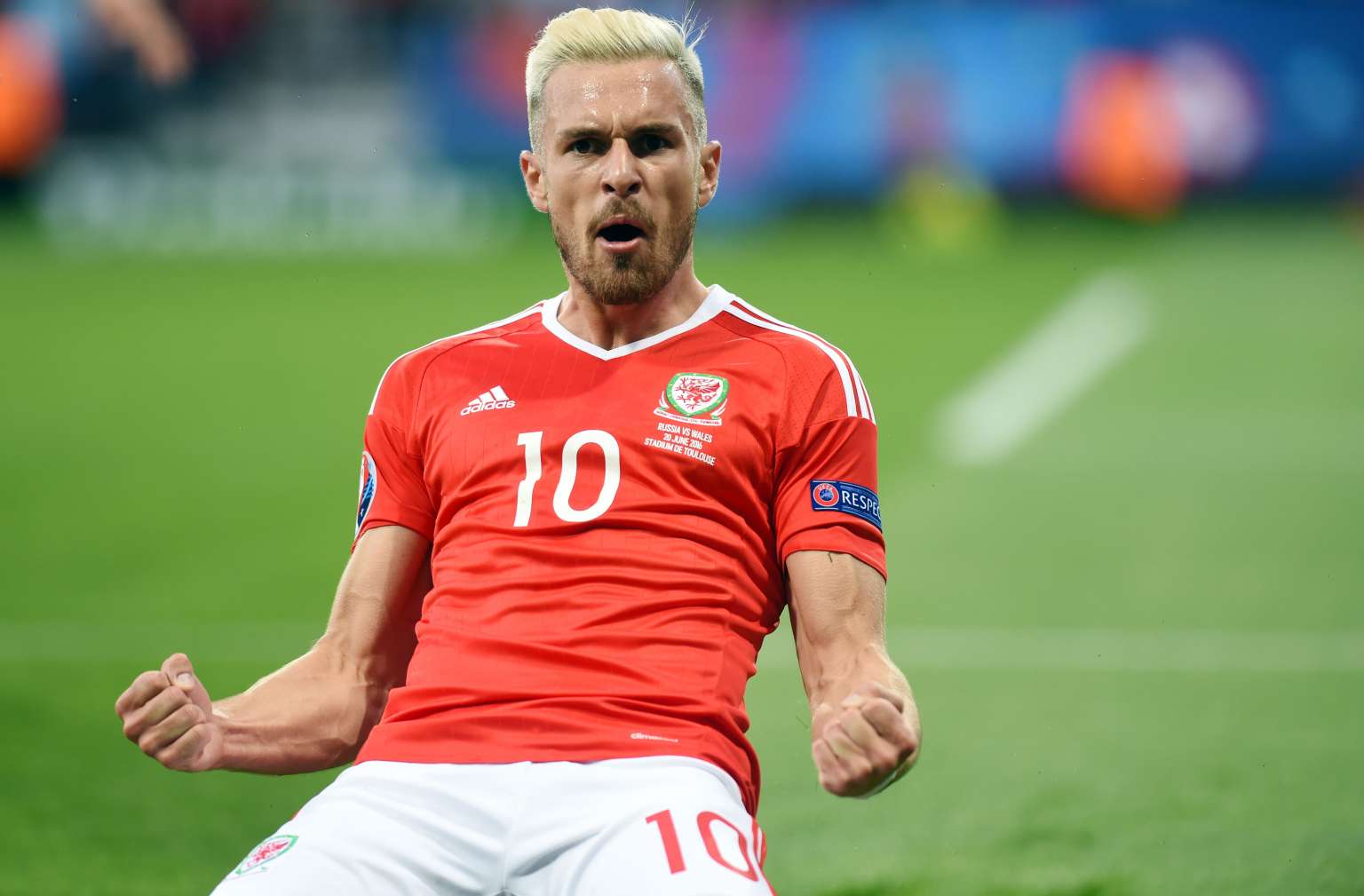 Wales' midfielder Aaron Ramsey celebrates the team's first goal.