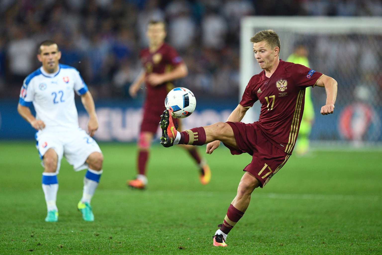 Russia's midfielder Oleg Shatov (right) the Euro 2016 group B football match between Russia and Slovakia at the Pierre-Mauroy stadium on June 15, 2016.