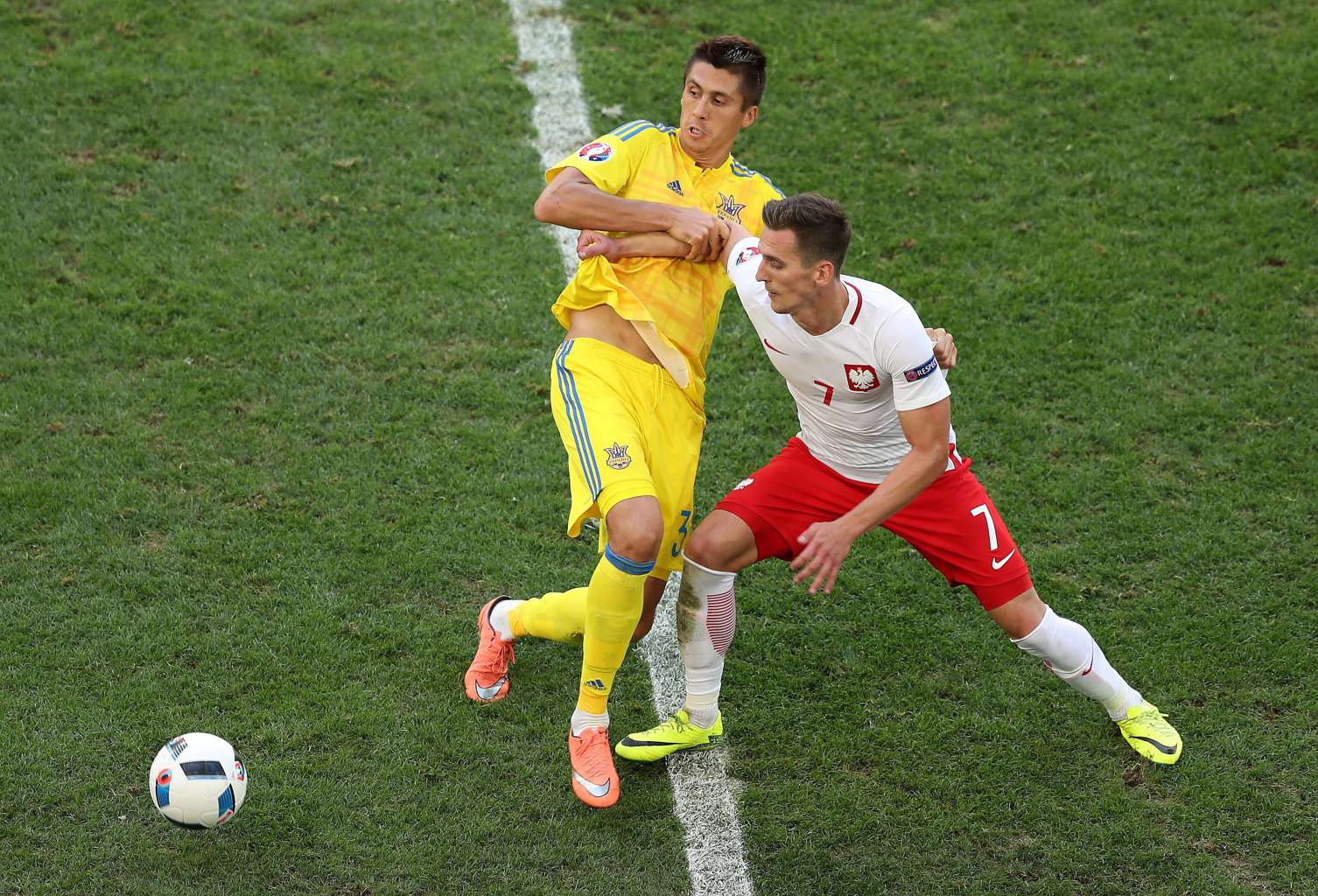 Arkadiusz Milik of Poland (right) and Yevhen Khacheridi of Ukraine in action during the UEFA Euro 2016 group C preliminary round match between Ukraine and Poland at Stade Velodrome in Marseille, France, on June 21, 2016.