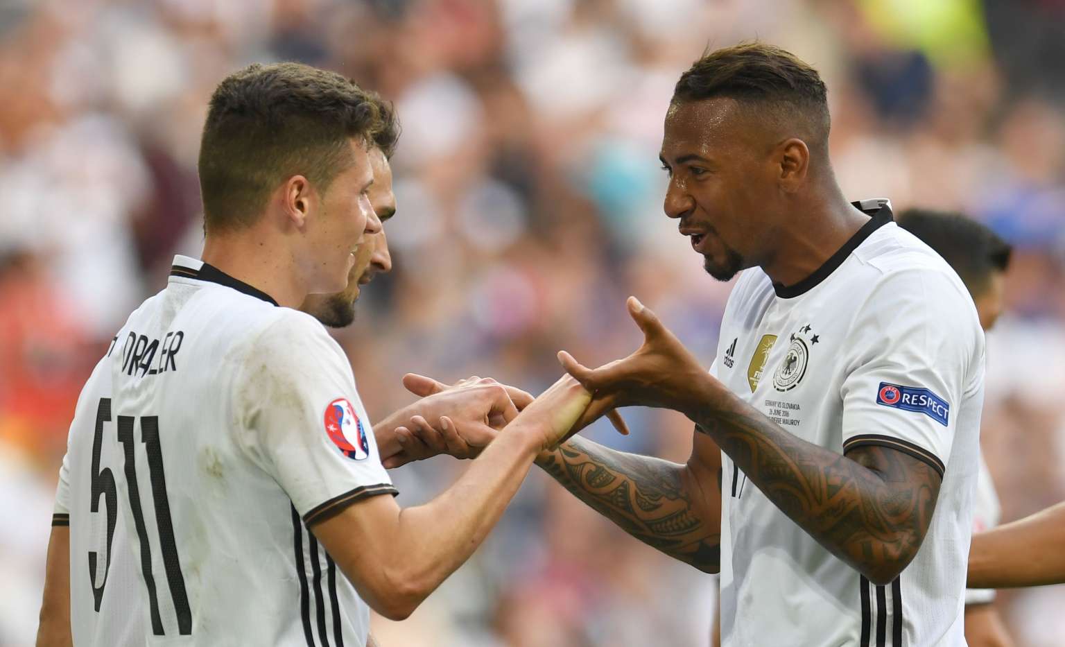 Germany's midfielder Julian Draxler (left) and Germany's defender Jerome Boateng celebrate their team's second goal during the Euro 2016 round of 16 football match between Germany and Slovakia at the Pierre-Mauroy stadium in Villeneuve-d'Ascq near Lille on June 26, 2016.