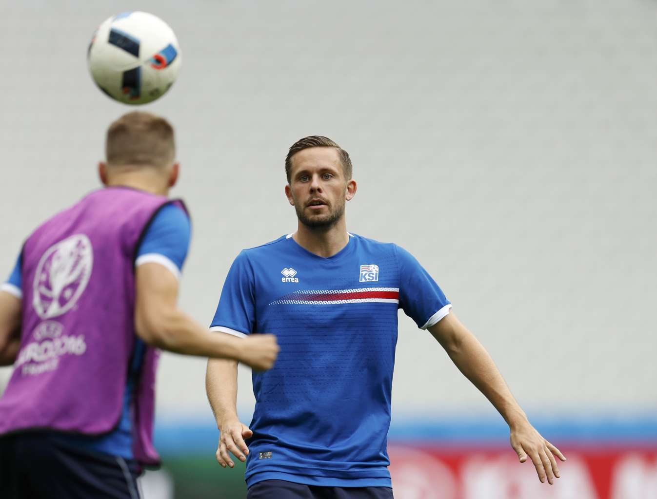 Iceland's Gylfi Sigurdsson (right) during training on June 21, 2016.