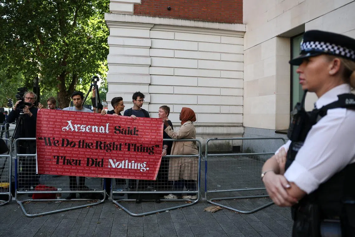 People protest against Arsenal FC outside Westminster Magistrates’ Court in London, Britain, on Aug 5, 2025.