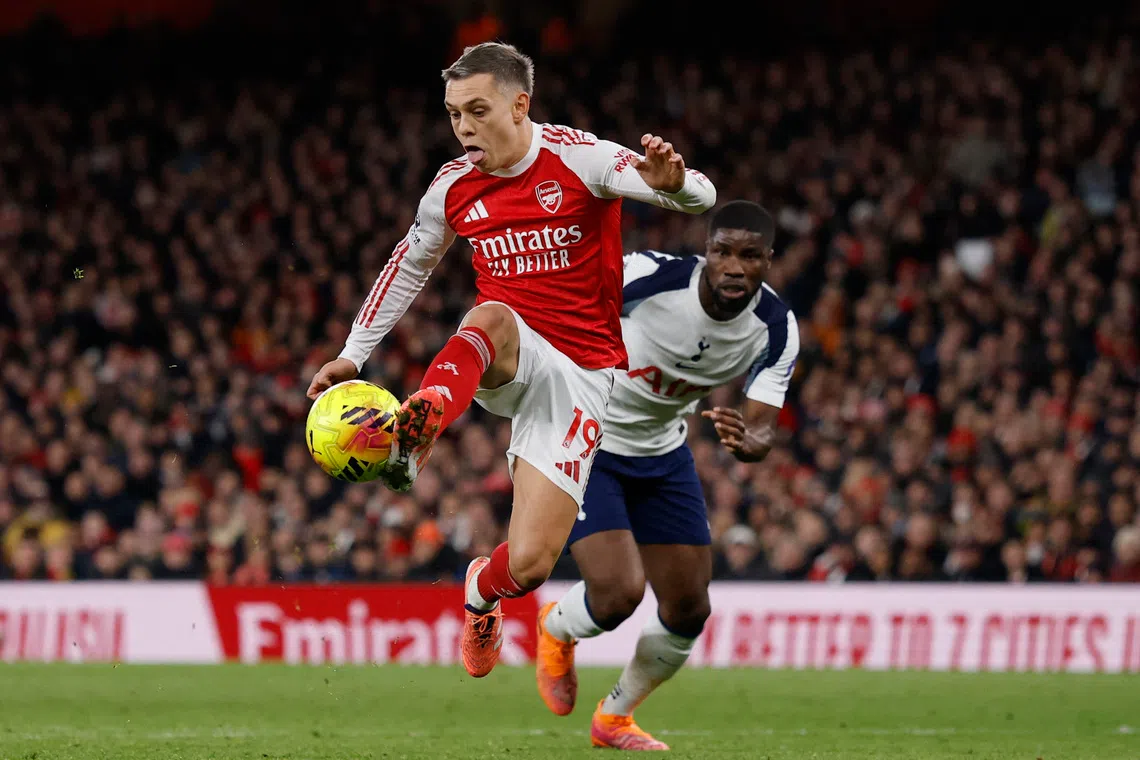 Arsenal's Leandro Trossard in action with Tottenham Hotspur's Kevin Danso.