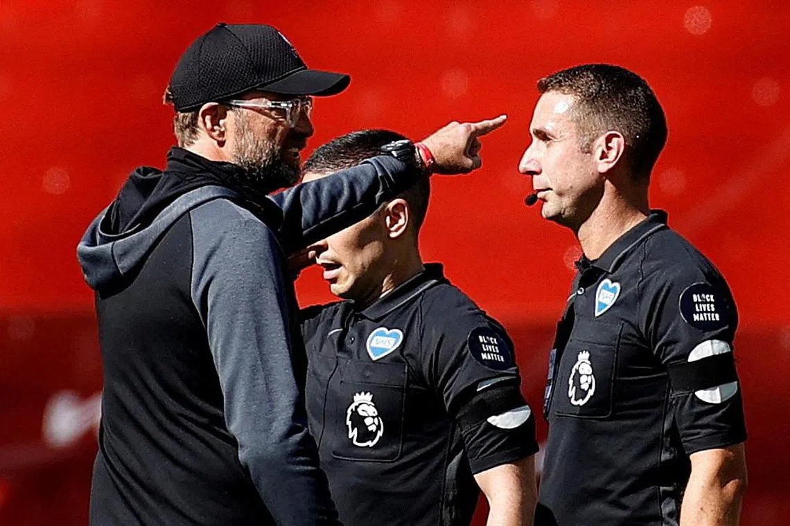 Then Liverpool manager Jurgen Klopp (left) speaking to referee David Coote after his team’s July 2020 match against Burnley.