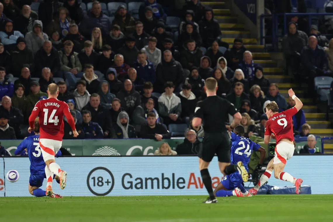 Manchester United's Alejandro Garnacho scoring their second goal in a comfortable 3-0 English Premier League win at Leicester City on March 16 at the King Power.