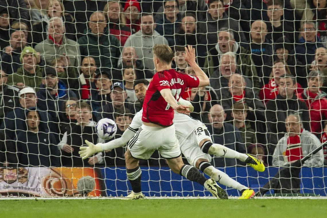 Manchester United’s Rasmus Hojlund scores their fourth goal against Sheffield United from a Bruno Fernandes pass.
