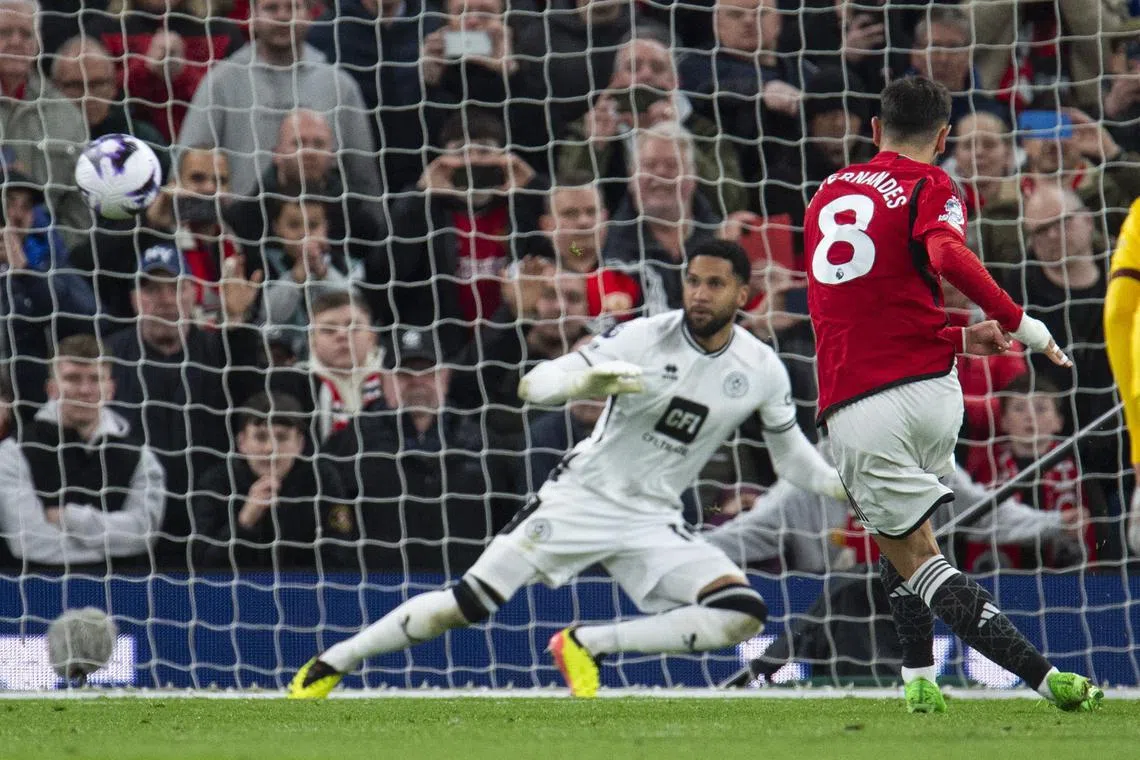 Manchester United’s Bruno Fernandes (right) scores the 2-2 equaliser from the penalty spot against Sheffield United.