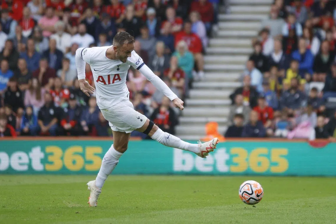 Tottenham Hotspur’s James Maddison scores their first goal.