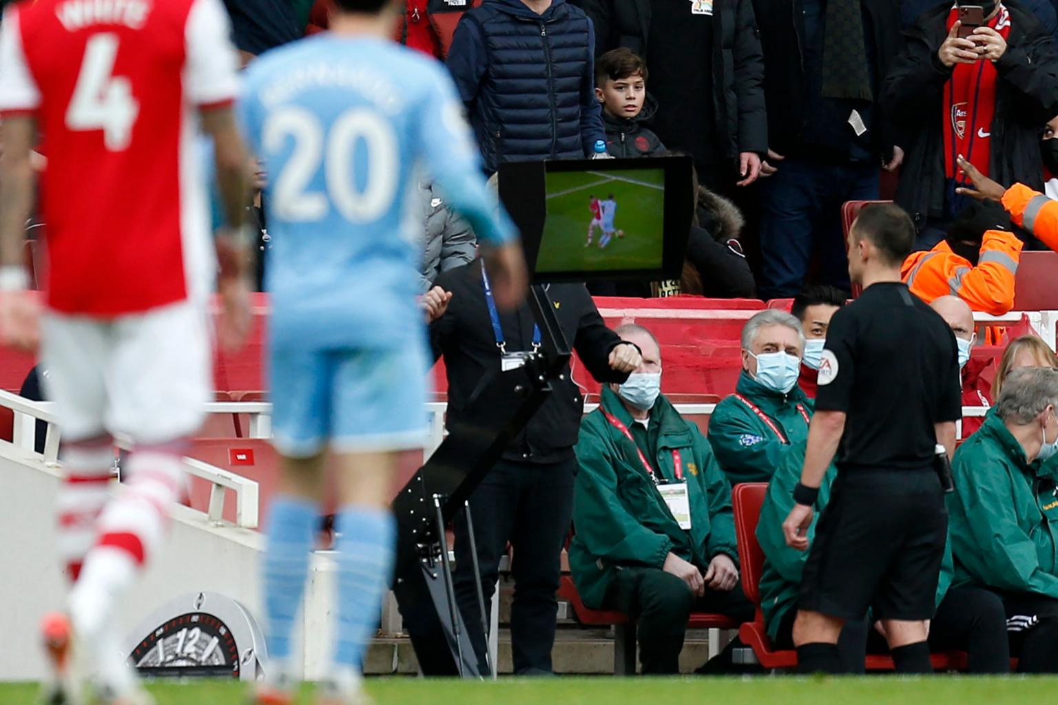 Referee Stuart Attwell checking VAR before awarding a penalty to Manchester City at the Emirates Stadium on Jan 1, 2022.