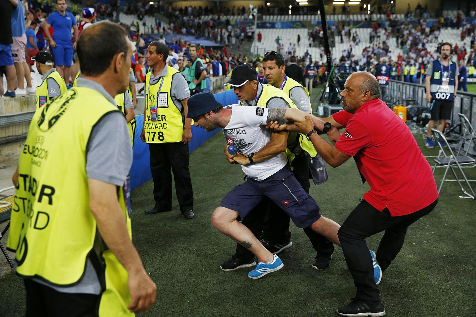 A fan is restrained by security after the game between England v Russia on Saturday (June 11).