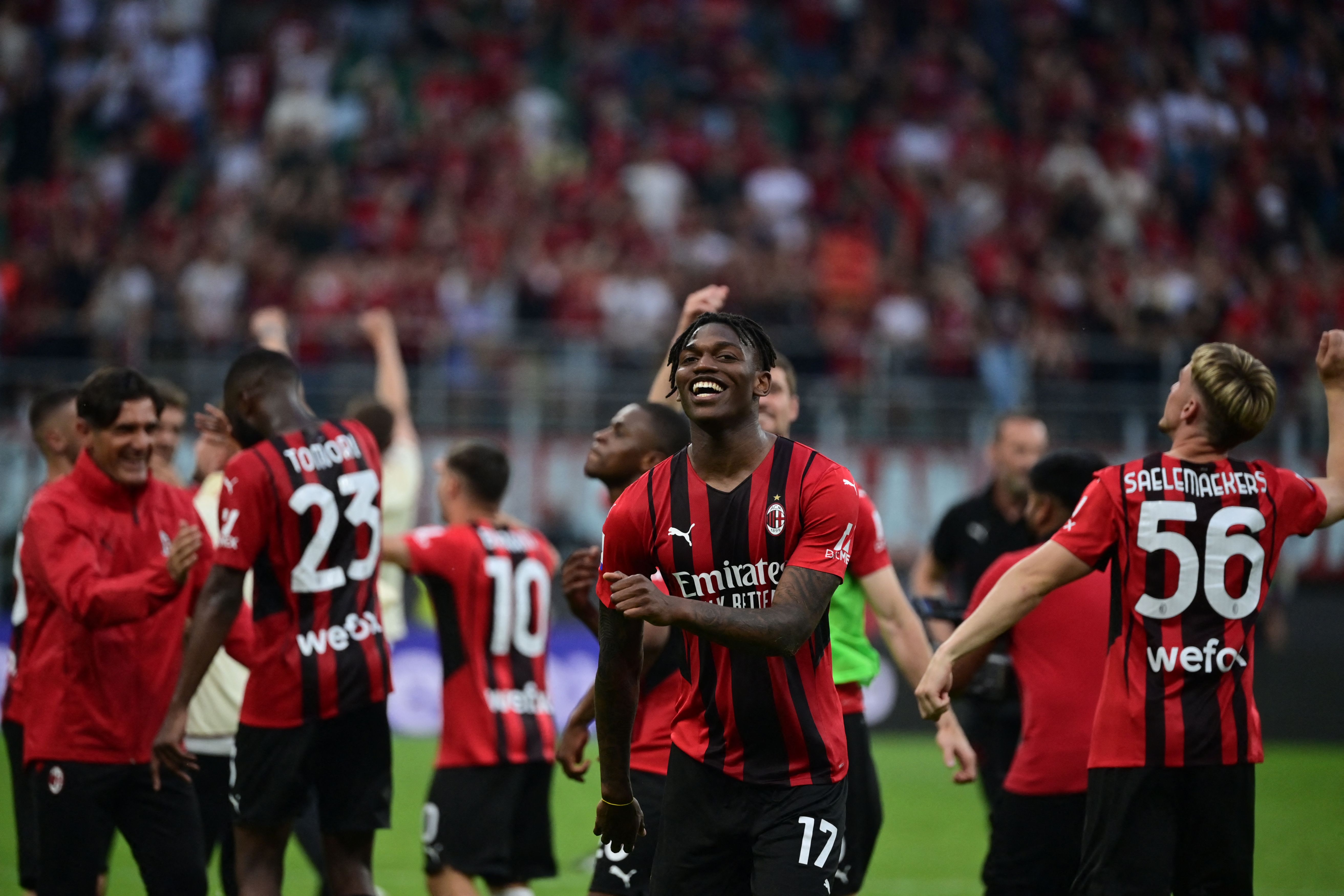 AC Milan players and Rafael Leao (centre) celebrate their 2-0 win over Atalanta, on May 15, 2022.