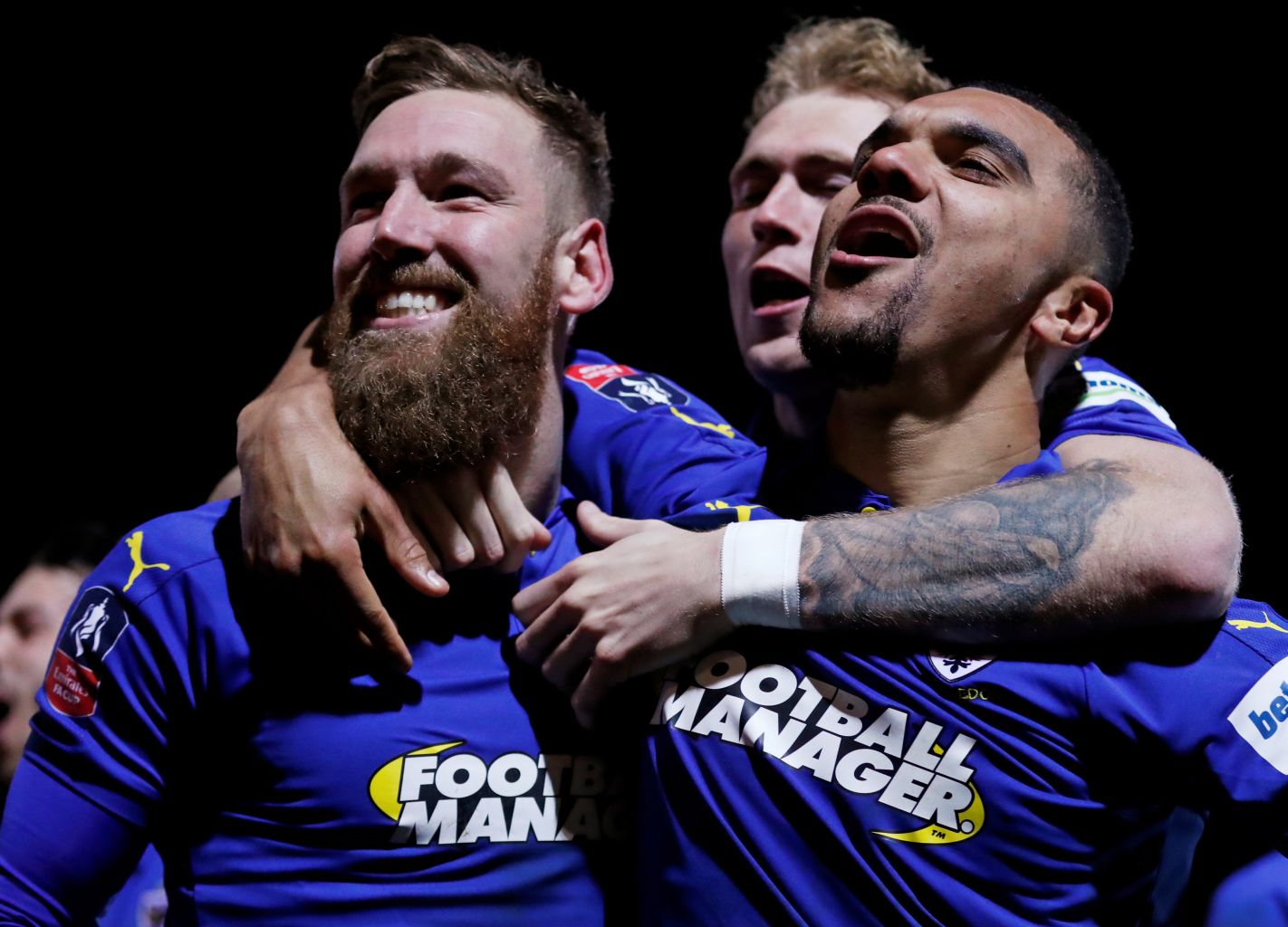 AFC Wimbledon's Scott Wagstaff celebrates scoring their third goal with team mates.