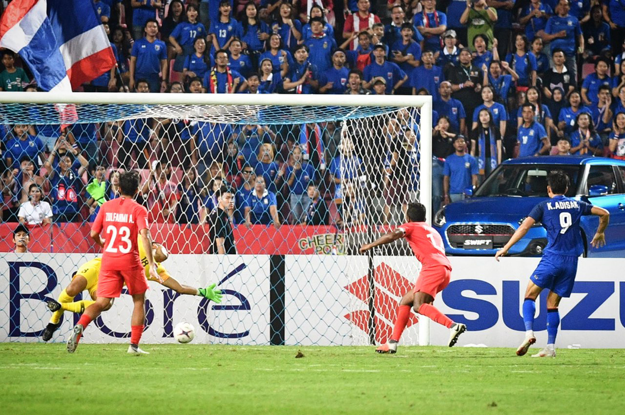 Thailand’s Adisak Kraisorn (in blue) scores in the Asean Football Federation Suzuki Cup in the Rajamangala Stadium, Bangkok, on Nov 25, 2018.