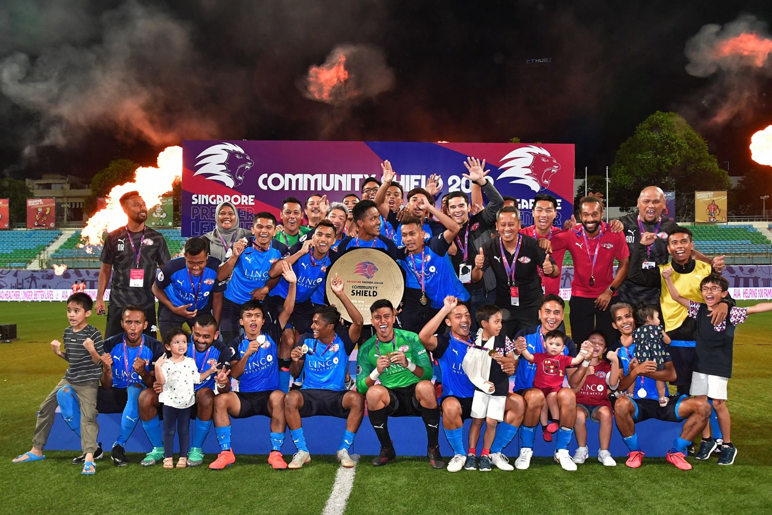 Home United celebrate after winning the Singapore Premier League Community Shield on Feb 23, 2019 at Jalan Besar Stadium.