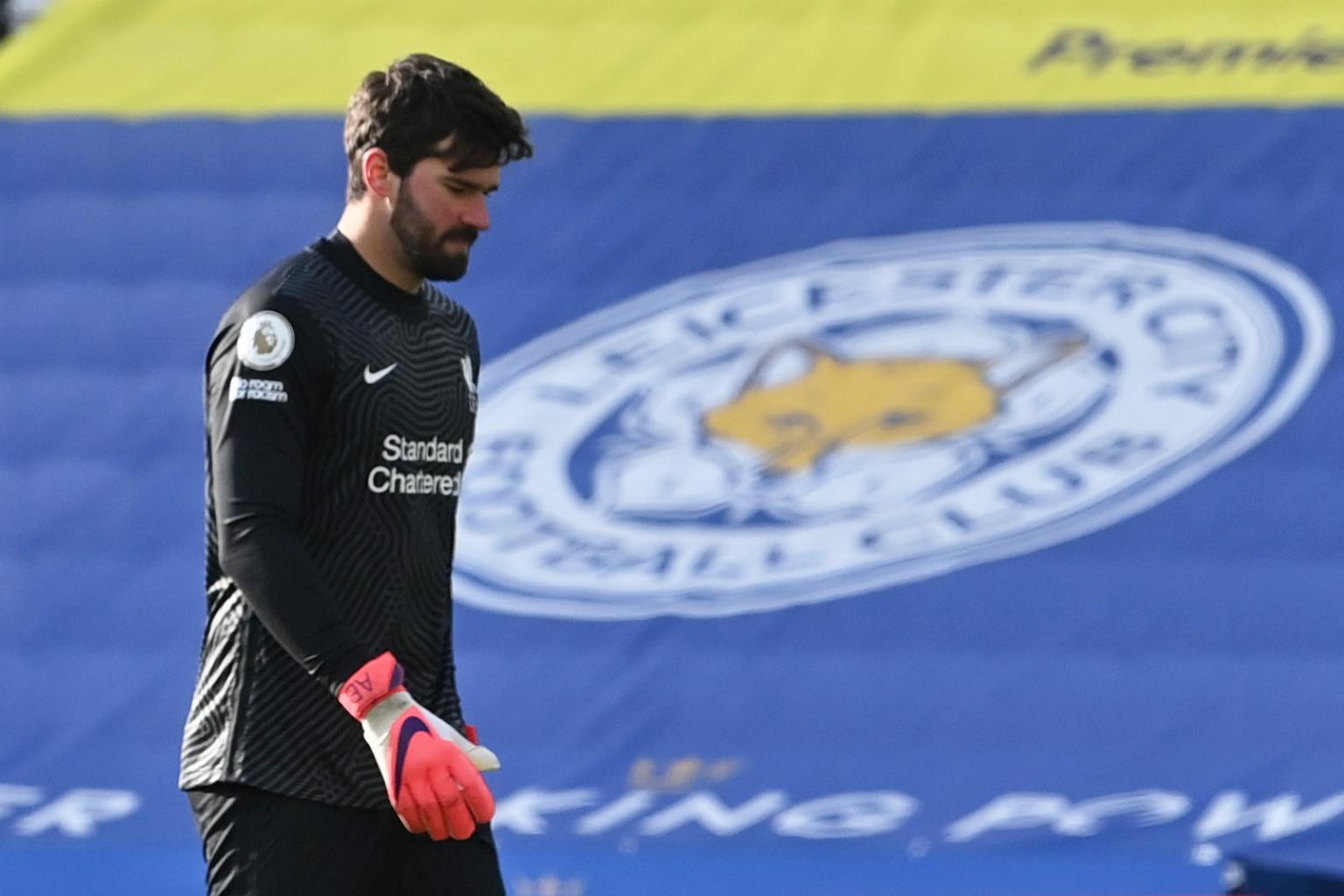 Liverpool's Alisson looks dejected after Leicester City's Jamie Vardy scores their second goal on Feb 13, 2021.