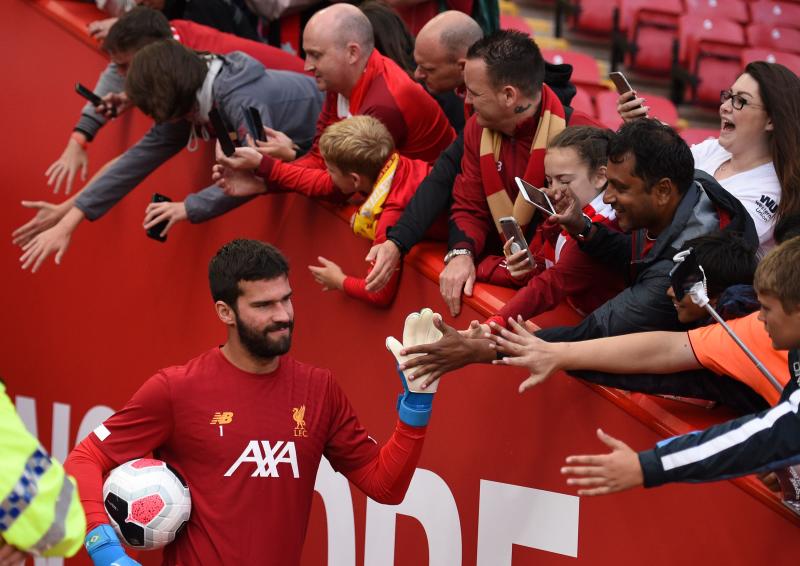 In a photo taken on Aug 9, 2019, Liverpool's Brazilian goalkeeper Alisson Becker greets fans before the English Premier League football match between Liverpool and Norwich City at Anfield in Liverpool, north west England.