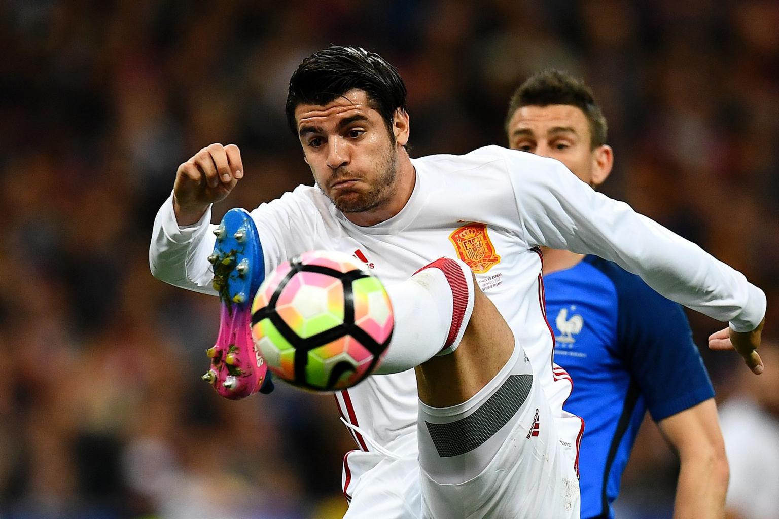 This file photo taken on March 28, 2017 shows Spain's forward Alvaro Morata controls the ball during the friendly football match France vs Spain at the Stade de France stadium in Saint-Denis, north of Paris.