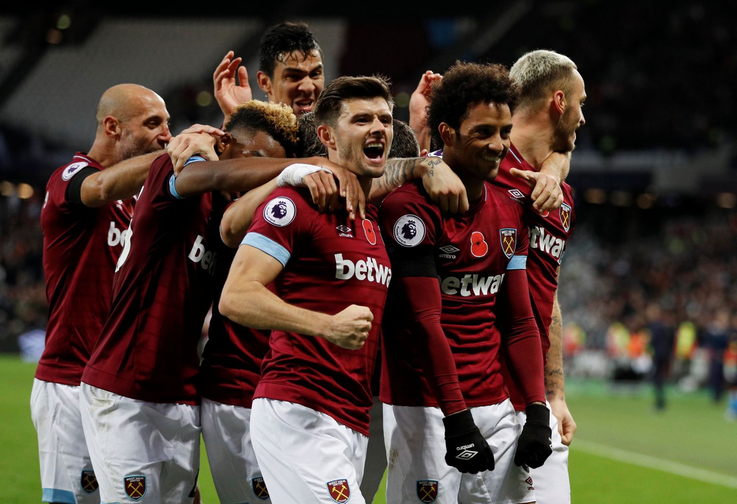 West Ham's Felipe Anderson celebrates scoring their third goal with team mates.