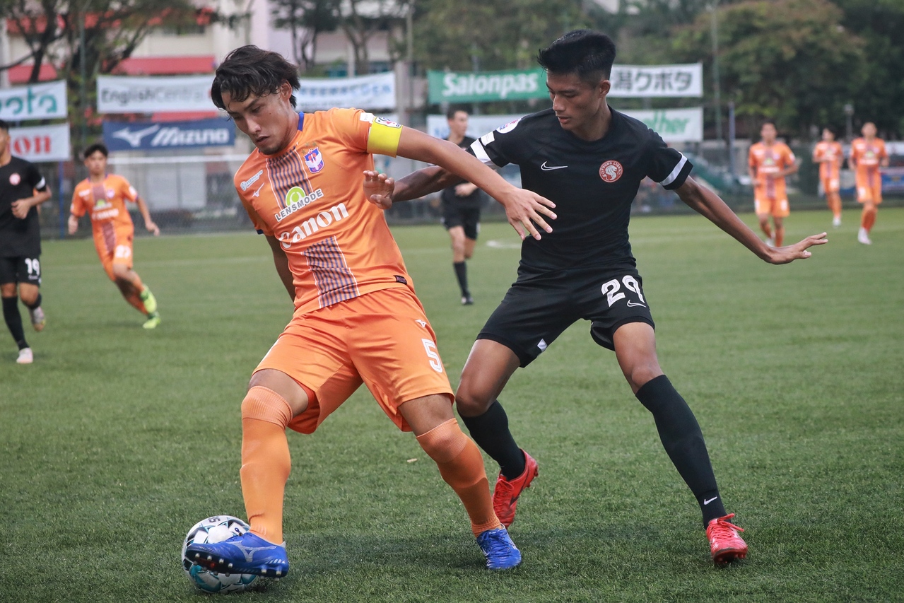 Albirex Niigata’s Kazuki Hashioka (left) in action against Young Lions’ Raoul Suhaimi during a Singapore Premier League match at Jurong East Stadium, on May 15, 2021.