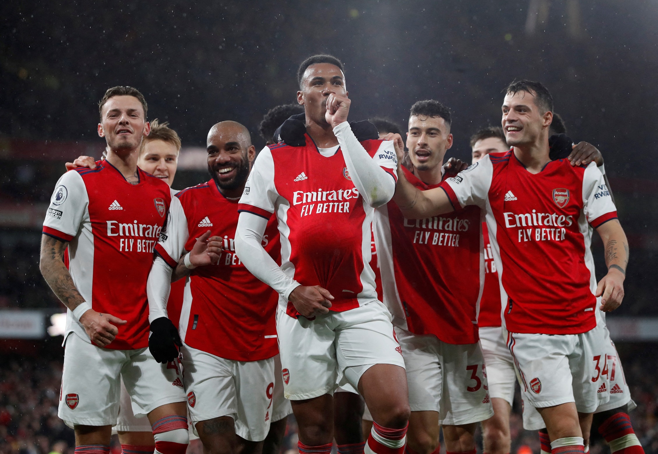 Arsenal's Gabriel celebrates scoring their third goal with teammates.