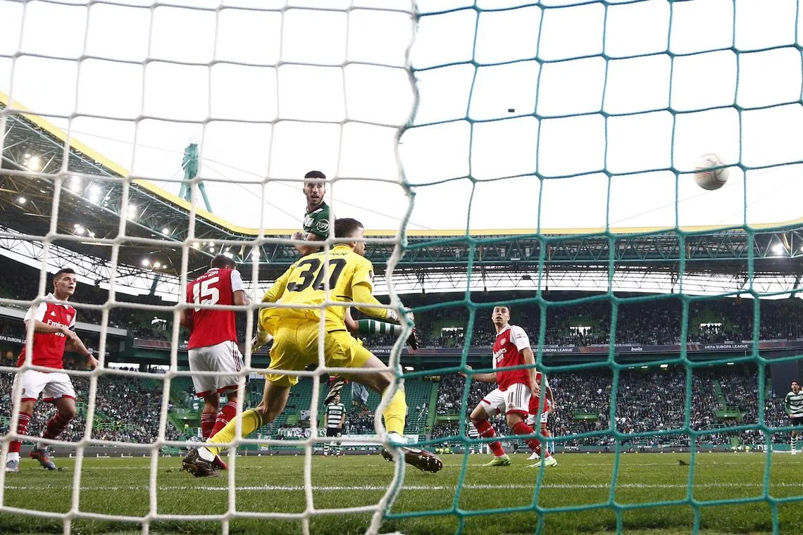 Sporting CP’s Goncalo Inacio scores their first goal past Arsenal’s Matt Turner.