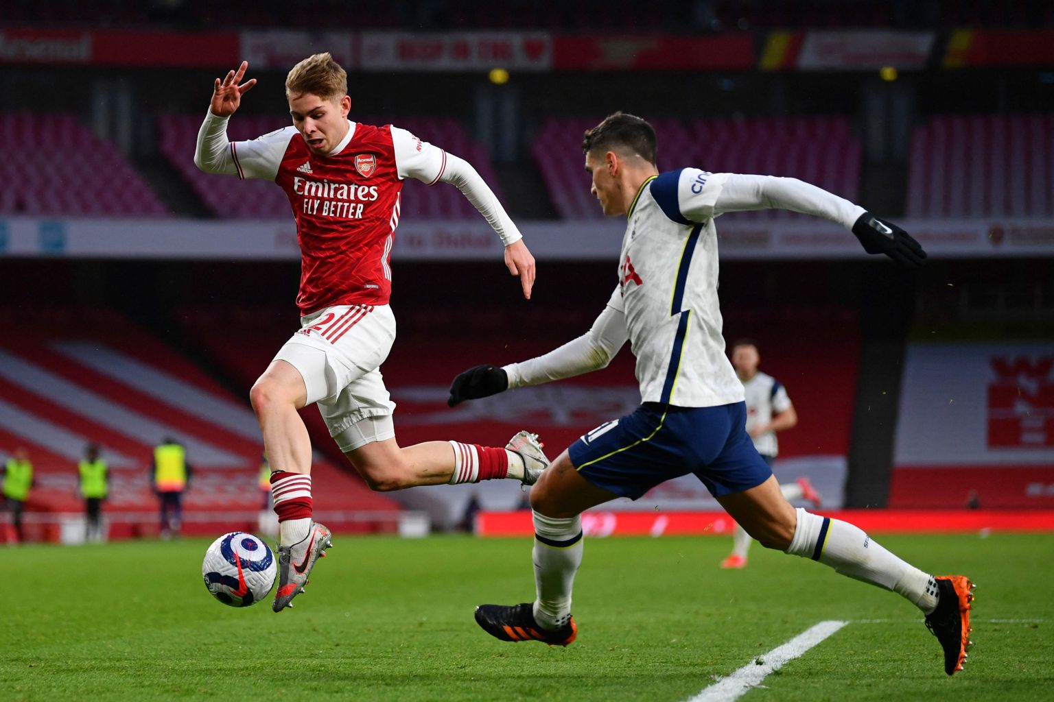 Arsenal's Emile Smith Rowe (left) vies for the ball with Tottenham Hotspur's Erik Lamela in London, on March 14, 2021.