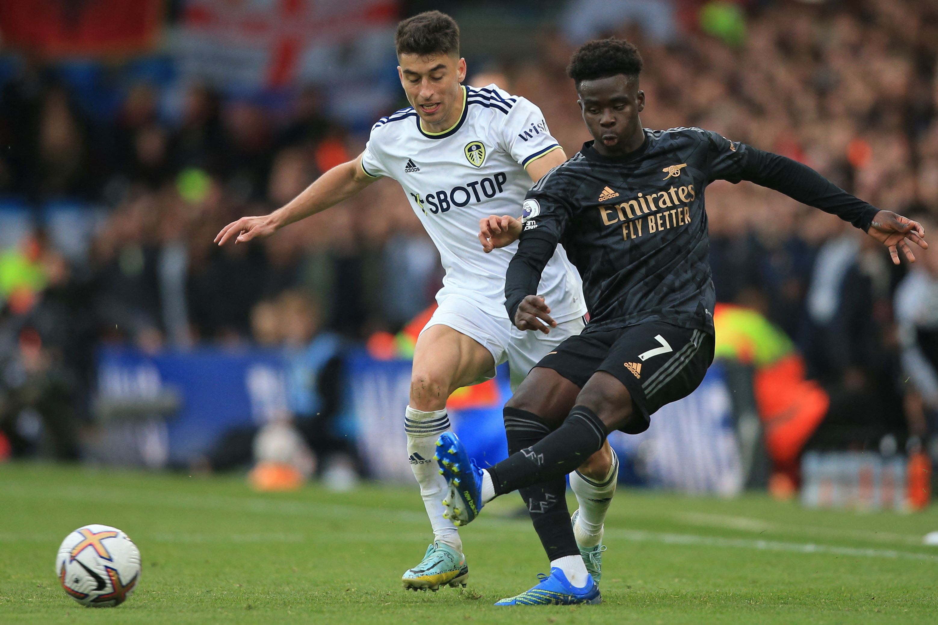 Leeds United midfielder Marc Roca (left) vies with Arsenal midfielder Bukayo Saka, who scored the winning goal for his team.