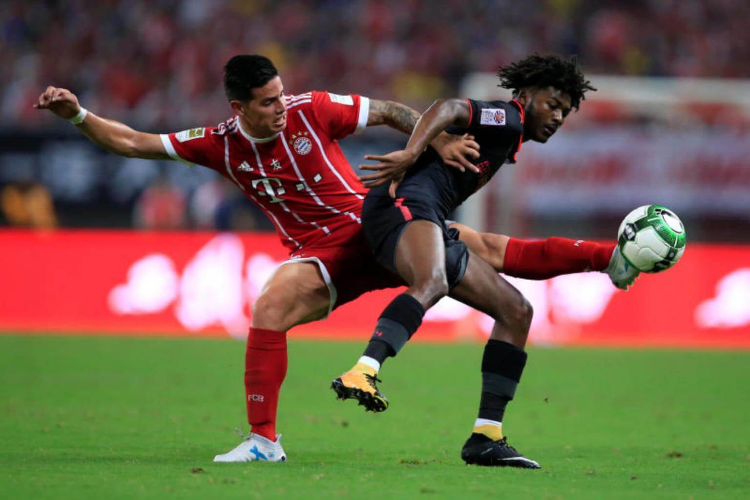 Bayern Munich's James Rodriguez (in red) in action with Arsenal's Ainsley Maitland-Niles .