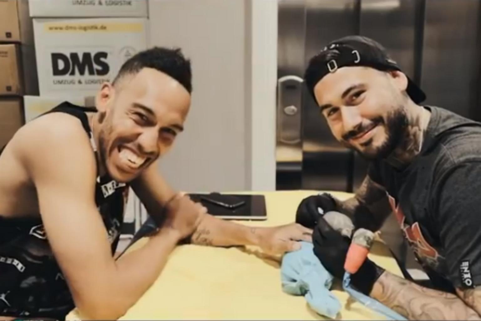 Tattoo artist Alejandro Nicolas Bernal (right) posted the video where Aubameyang is seen to get a new tattoo on his hand.