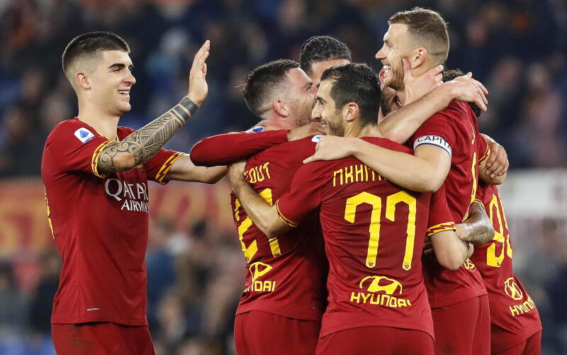 Roma's Edin Dzeko (right) celebrates with teammates after scoring during the Serie A match against US Lecce at the Olimpico stadium in Rome on Feb 23, 2020.