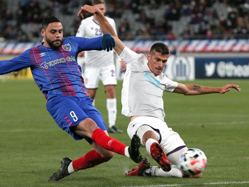 FC Tokyo's Diego Oliveira (left) and Perth Glory's Tomislav Mrcela in action during an AFC Champions League match in Tokyo on Feb 18, 2020.
