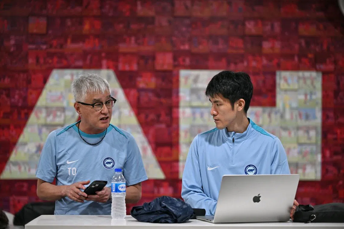 National coach Tsutomu Ogura (left) and head analyst Satoru Okada at Kallang Football Hub on March 19.
