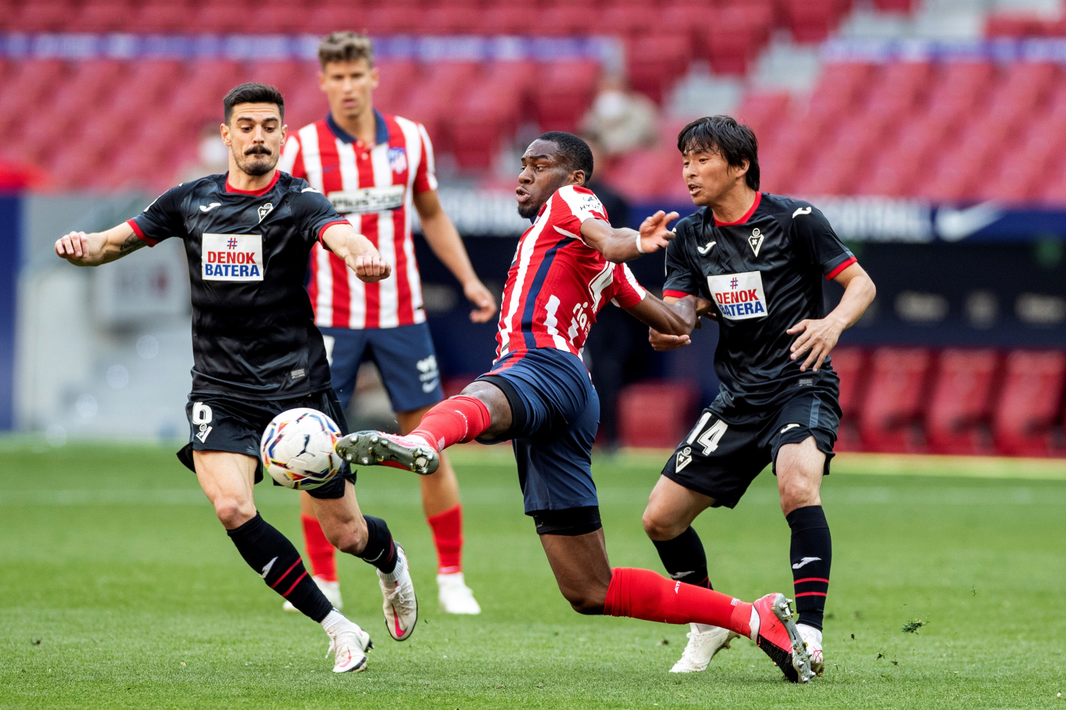 Atletico Madrid's Geoffrey Kondogbia (centre) vies for the ball with Eibar's Aleix Garcia (left) and Takashi Inui (right) on April 18, 2021.